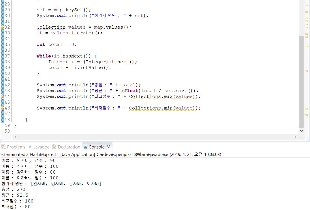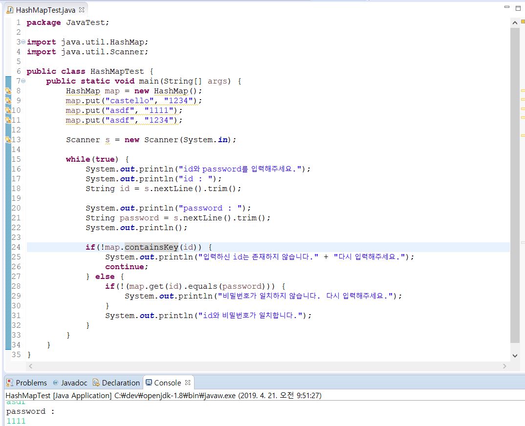 전형적인 HashMap 예제입니다. 소스는 간단해서 그냥 눈으로 확인하셔도 이해를 하시리라 믿습니다.