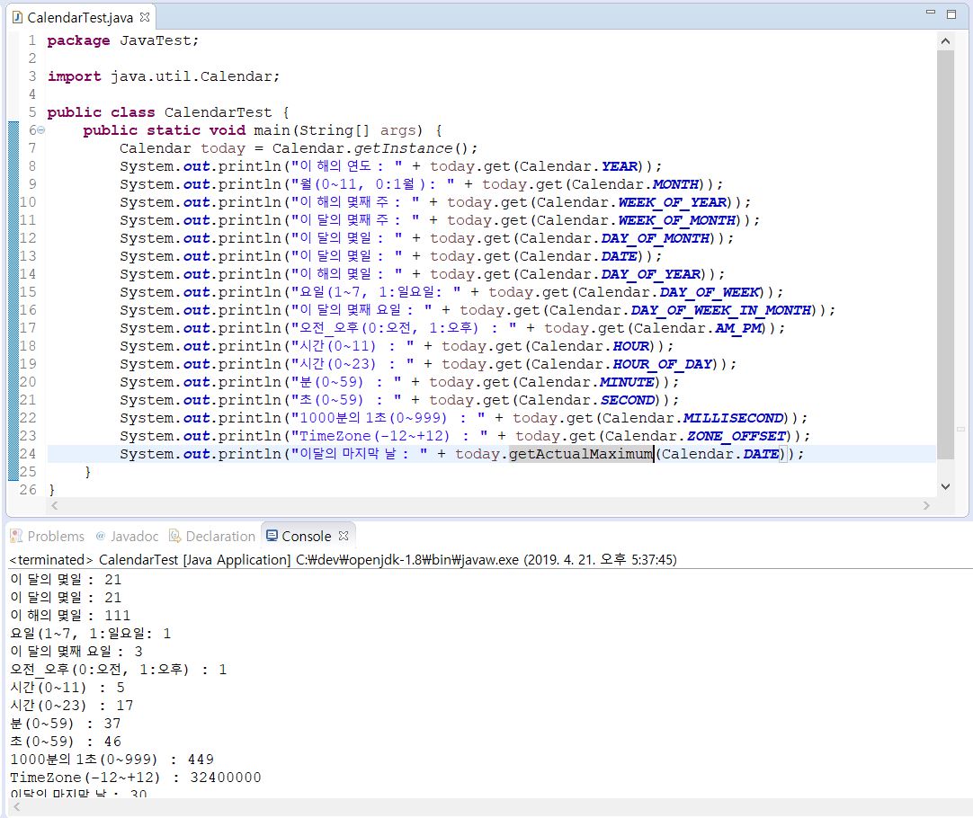 Calendar 클래스는 추상클래스이기 때문에 직접 객체를 생성할 수 없고, 메서드를 통해서 완전히 구현된 클래스의 인스턴스를 얻어와야 합니다.