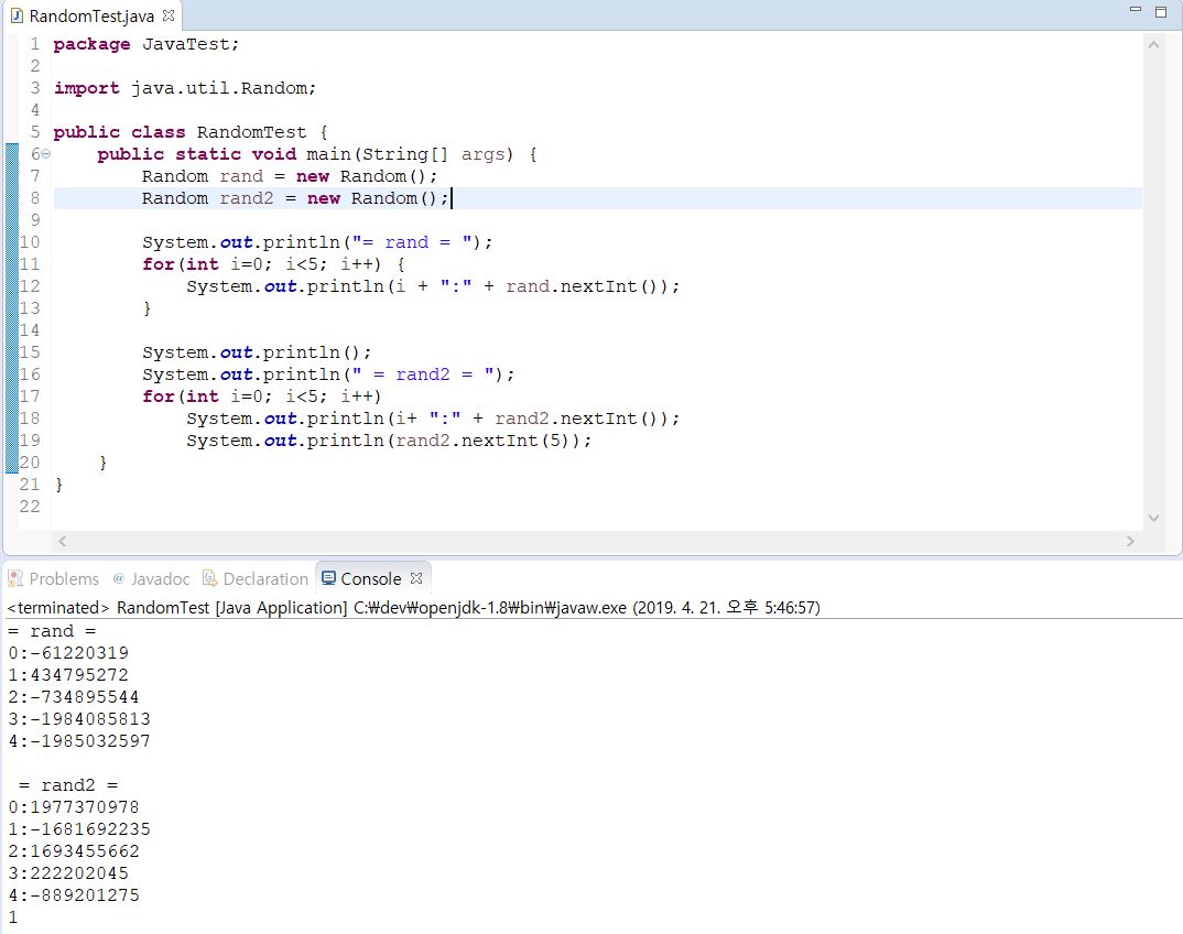Random 클래스를 사용하면 난수를 얻어올수 있습니다. 이건 Math.random()과 같다고 볼 수 있습니다.