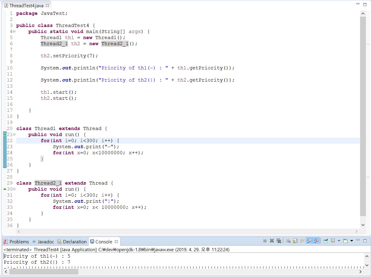 아래 쓰레드의 우선순위 예제를 보시고 쓰레드의 우선순위를 음미해 보시기 바랍니다.