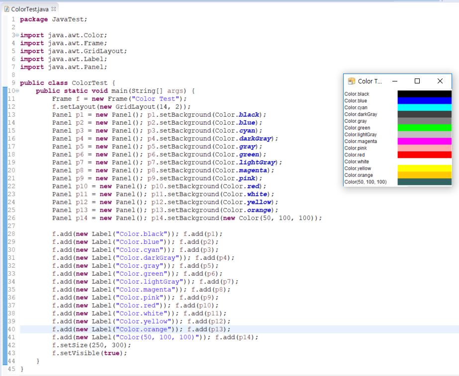 Color는 색을 표현하기 위해 사용되는 클래스로써, 원하는 색의 RGB값만 알고 있으면 그 색을 표현할 수 있는 객체를 생성하여 사용할 수 있습니다.