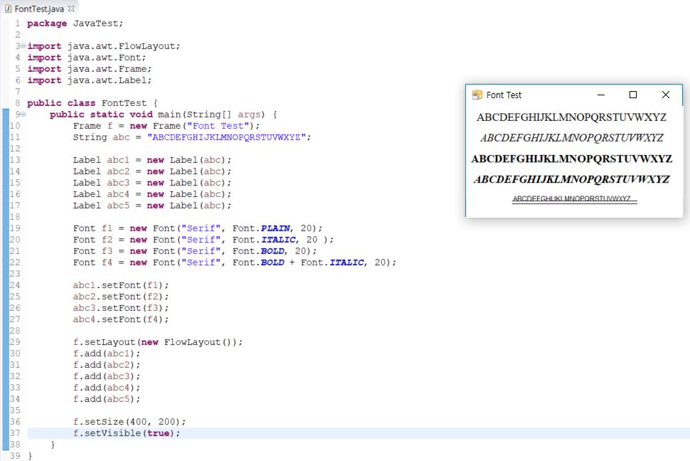 Component에 setFont(Font f)를 이용하면, 컴포넌트에 사용되는 text의 글자체를 원하는 것으로 지정할 수 있습니다.