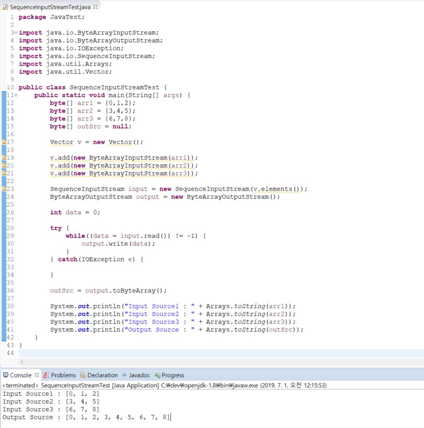SequenceInputStream의 생성자를 제외하고 나머지 작업은 다른 입력스트림과 다르지 않습니다.