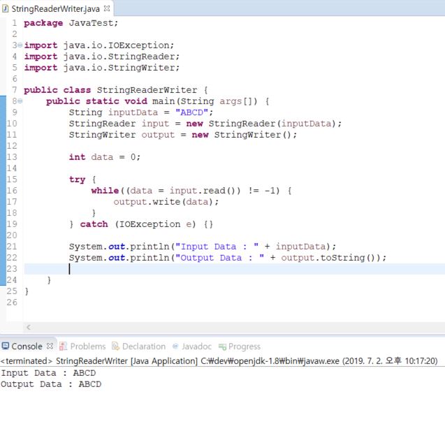 StringReader/StringWriter는 CharArrayReader/CharArrayWriter와 같이 입출력 대상이 메모리인 스트림입니다.