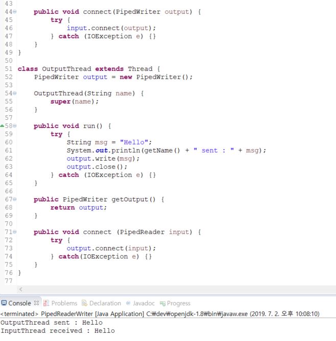 스트림을 생성한 다음에 어느 한쪽 쓰레드에서 connect()를 호출해서 입력스트림과 출력스트림을 연결합니다.