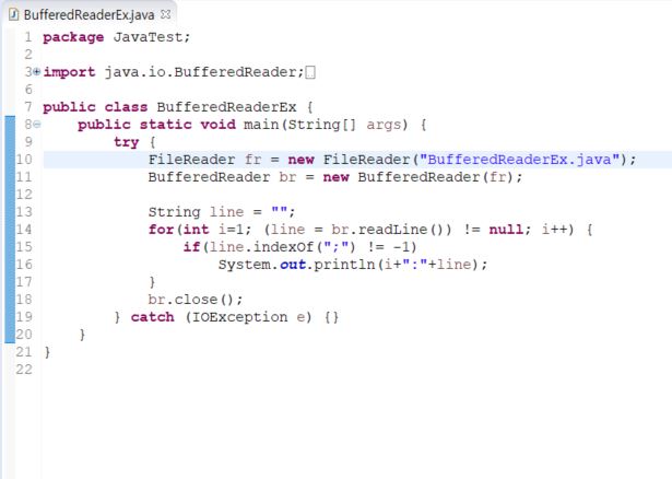 그리고 readLine()이라는 줄바꿈 메서드를 이용해서 파일을 라인단위로 읽은 다음 indexOf()를 이용해서 ';'를 포함하고 있는지 확인하여 출력해주는 예제를 아래와 같이 만들어 보겠습니다.