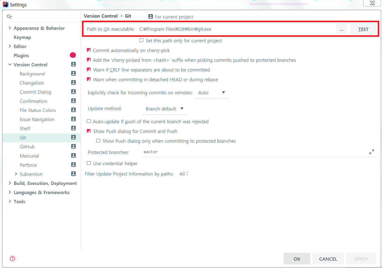 위의 빨간색 표시된 부분에서 Git 설치경로를 선택해준다음 TEST로 정상적으로 연결되는지 확인합니다.