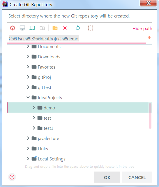 그런 다음 IntellJ 메뉴의 VCS > import into version control > create git repository를 선택하여 아래와 같은 창이 뜨면 자신이 생성한 프로젝트 파일을 선택하고 OK를 눌러줍니다.