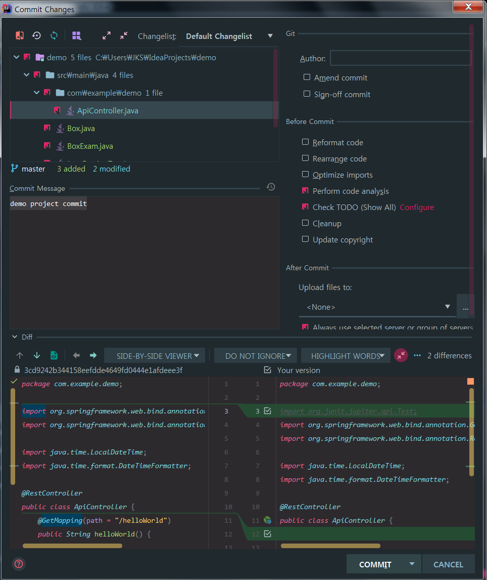 Review를 눌러 코드를 다시 리뷰하고 커밋을 진행하시면 되겠습니다.