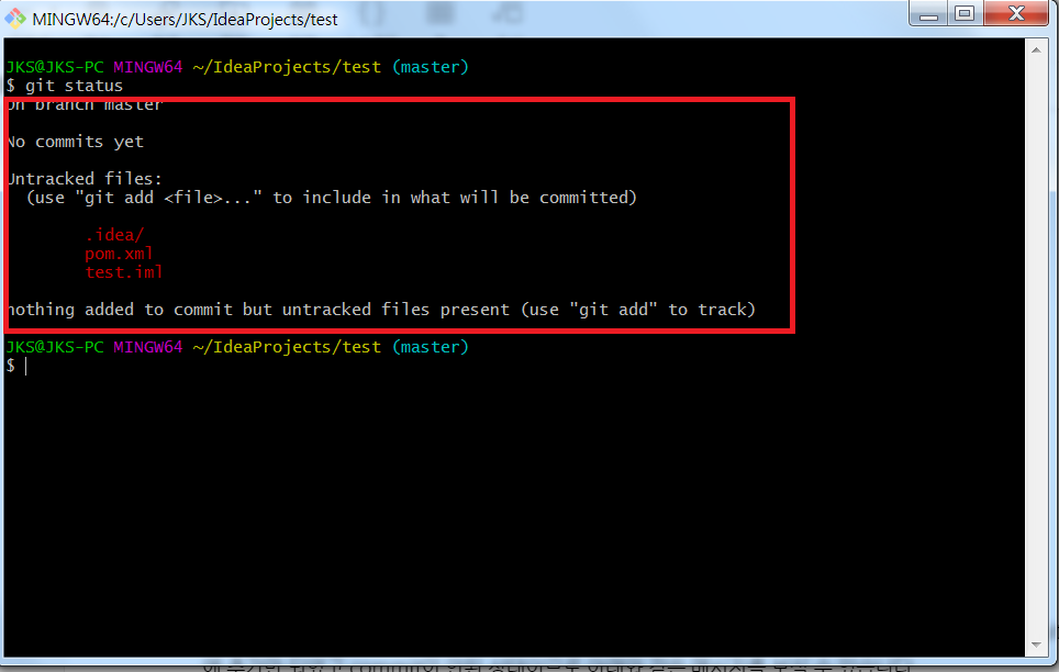저는 test를 선택하여 생성하였고, 그런다음 git bash를 선택하고 아래화면에서 보실 수 있듯이 아직 git의 stage에 추가만 되었고 commit이 안된 상태이므로 아래와 같은 메시지를 보실 수 있습니다.