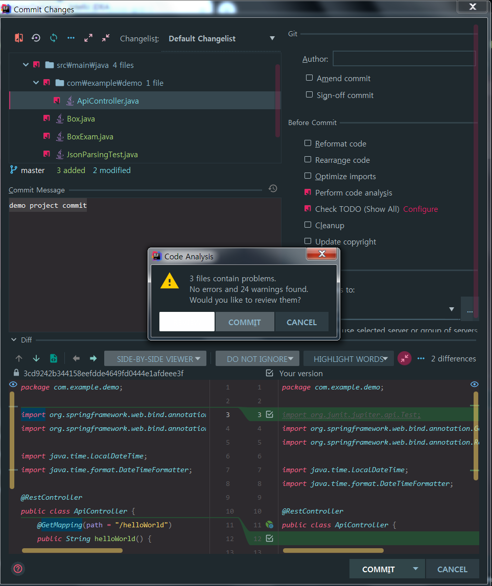 인텔리제이의 좋은 기능중의 하나가 code analysis를 해주는 기능이 있는데, 커밋을 실행했는데 코드에 문제가 있으면 아래와 같은 팝업이 뜨고 Review를 할지 수정없이 커밋할지를 결정해달라고 요구합니다.