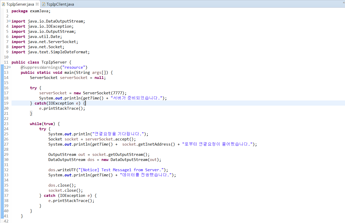 아래 TCP 소켓 프로그래밍 예제를 보시고 실행해 보시길 바랍니다.