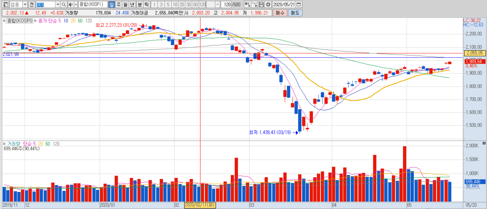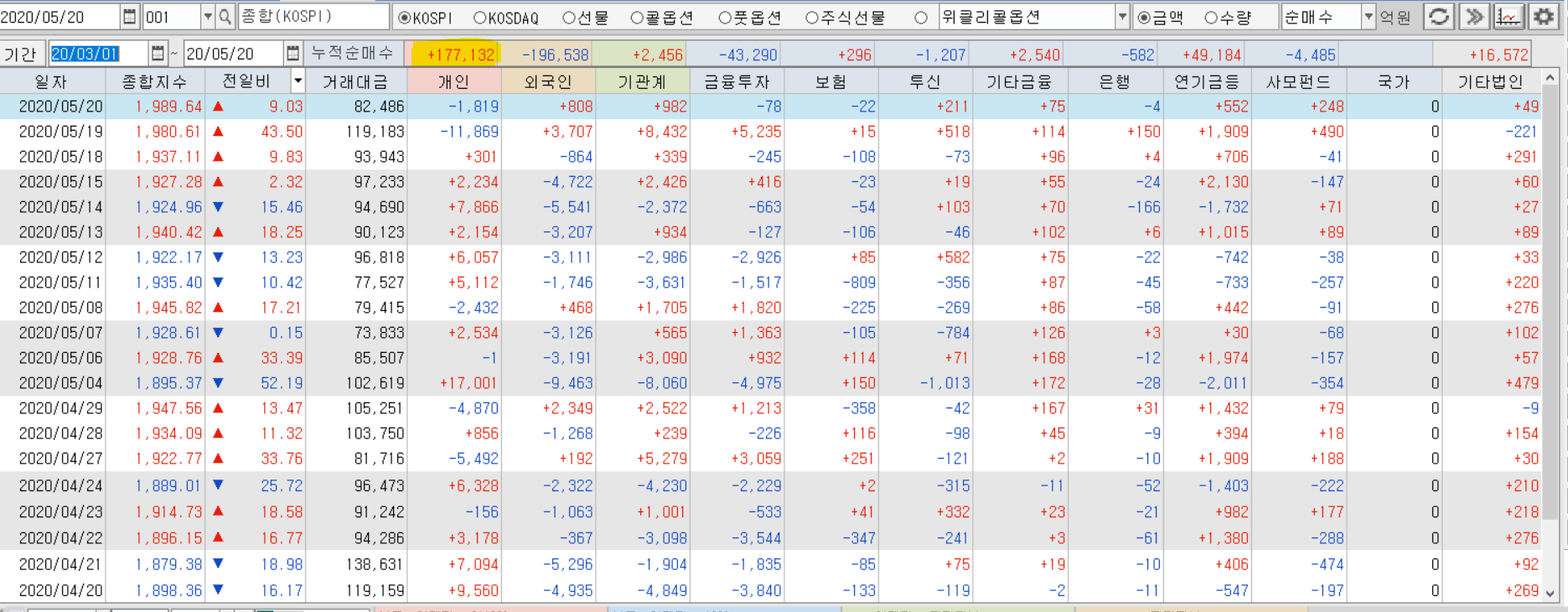 위그림은 코로나 발생을 기점으로 3/1 ~ 5/20의 투자자별 순매수 추이입니다. 개인이 17조의 누적 순매수를 보인점은 향후 외국인이 포지션을 어떻게 가져가느냐에 따라 폭탄이 될 수 도 있다는 개인적인 생각입니다.
