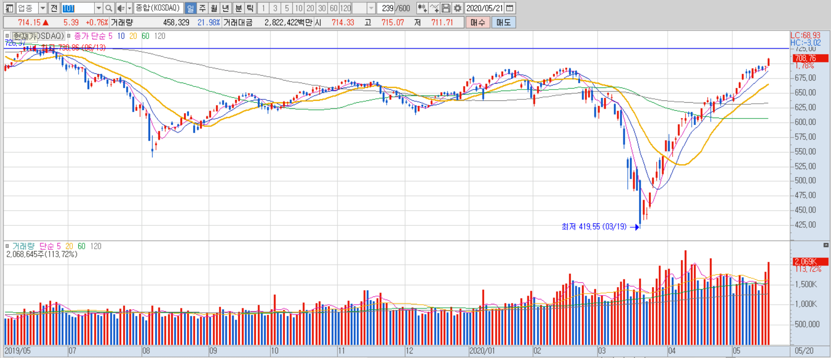 위는 코스닥 일봉차트입니다. 금일 700선을 넘는 강세를 보이며 거의 1년만에 700선을 돌파하는 좋은 흐름을 보여주었습니다.