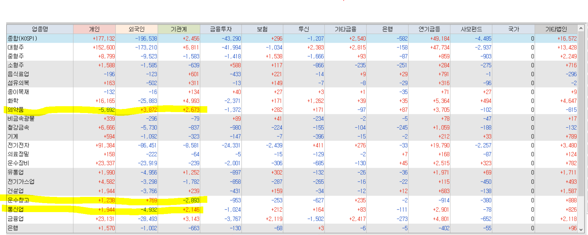 외인은 의약품업종과 운수창고에 순매수세를 보이고, 기관은 화학,유통업,통신업,금융업의 매수세가 강한것으로 보입니다.