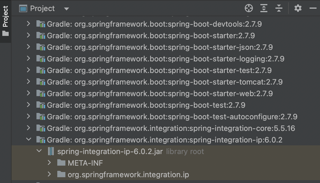 인텔리제이의 왼쪽패널의 External Libraries를 보면 아래와 같이 org.springframework.integration:spring-integration-ip:6.0.2 라이브러리가 다운로드되어져 있는것을 볼 수 있다.