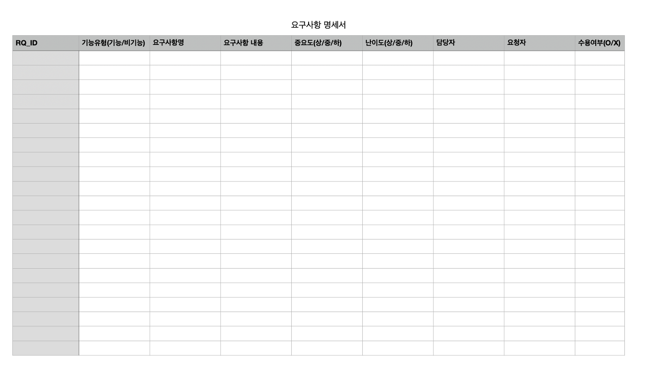 - 요구사항 ID: 요구사항을 식별할 수 있는 고유한 번호나 코드를 부여합니다. 이는 요구사항의 추적성과 관리성을 높이기 위해 필요합니다.