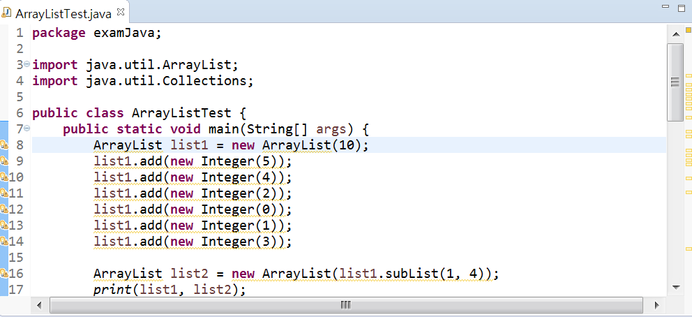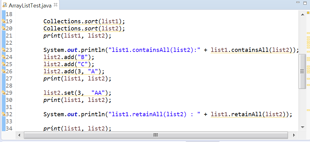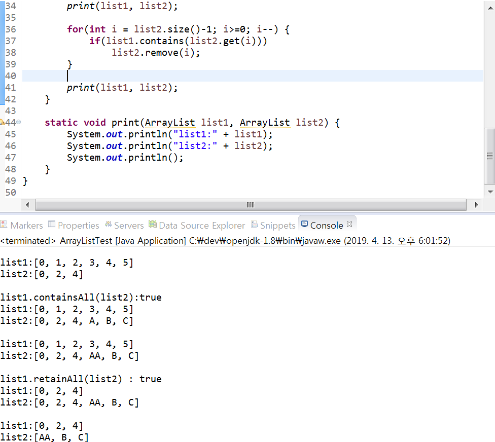 아래는 ArrayList 클래스의 사용과 ArrayList 클래스의 메서드들을 이용한 예제를 보여보았습니다.