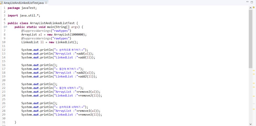 배열(ArrayList)은 가장 기본적인 형태의 자료구조이고 데이터의 접근속도가 빠르다는 장점이 있지만 순차적 접근이므로 중간에 데이터를 삽입하거나 제거할때 시간이 많이 걸리고 크기를 변경할 수 없다는 단점을 가지고 있습니다.